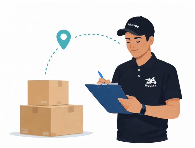 Close-up of a shipping label with moviqe branding on a carefully packed box.